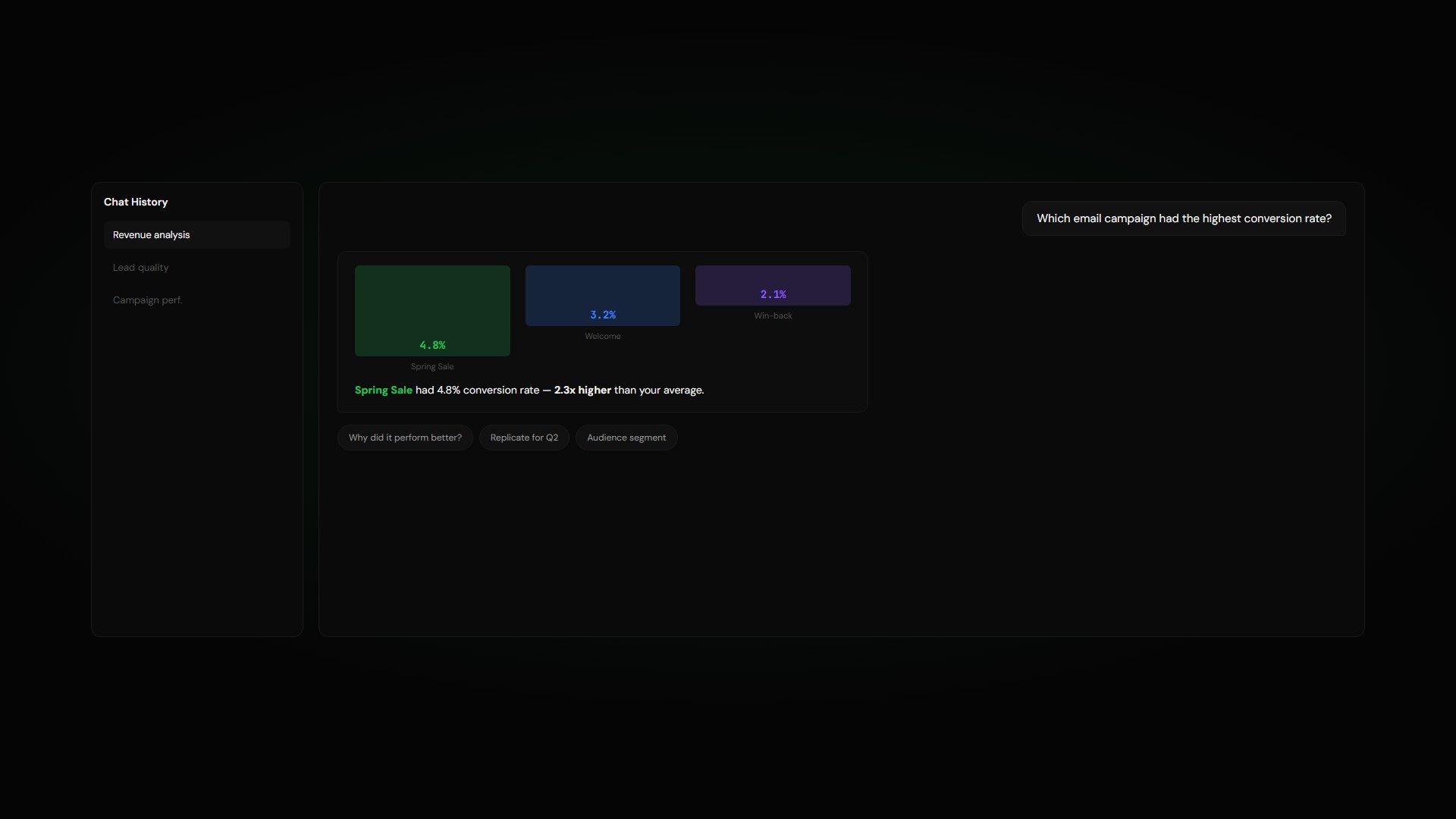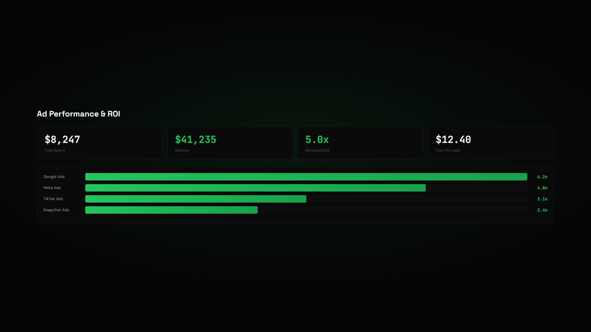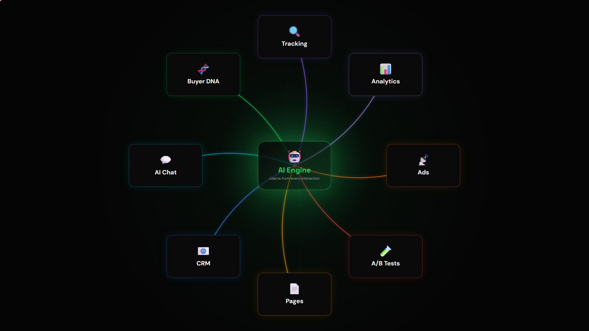 Every account comes with a custom AI chatbot trained on your actual business data — tracking, CRM performance, test results, everything. Ask it anything in plain English. Get answers, not dashboards.