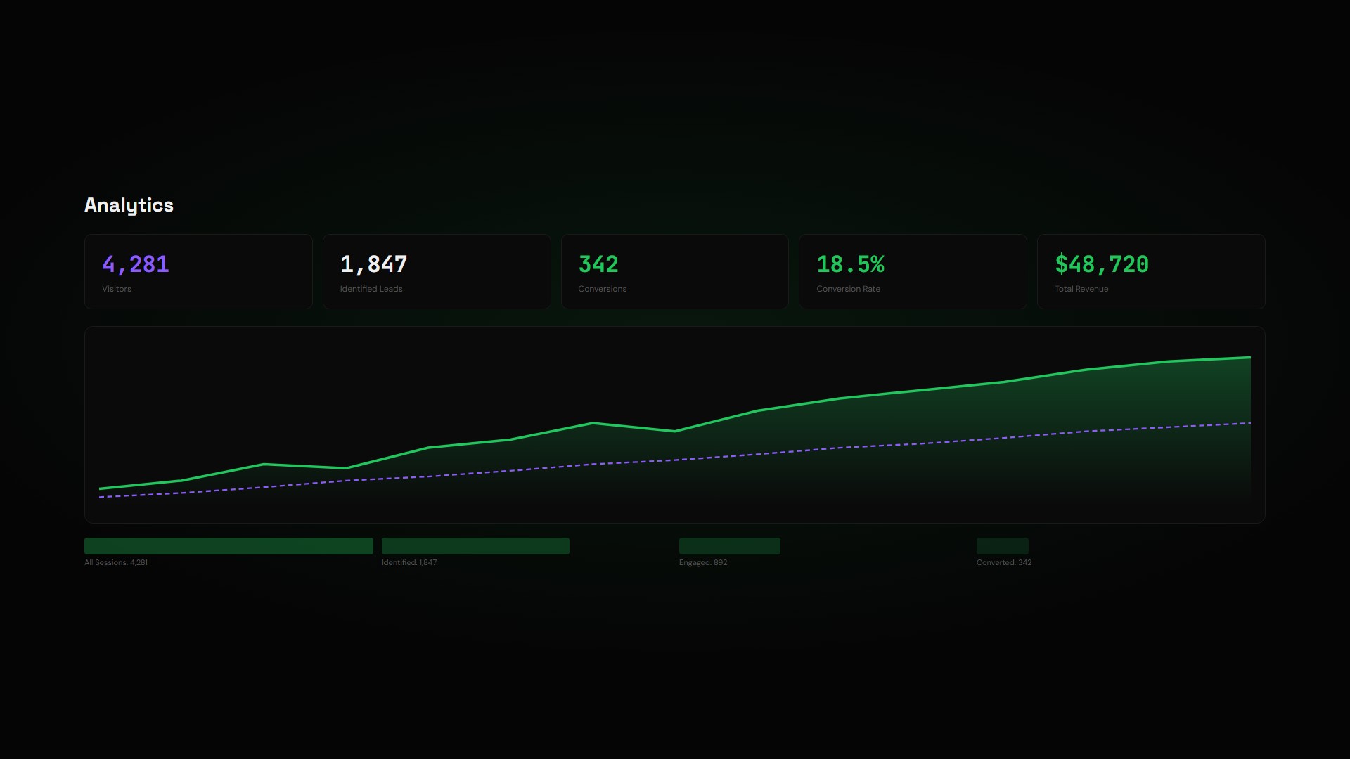 One line of JavaScript captures every page view, scroll depth, click, form submission, and session replay — across your entire site. No tag manager. No developer. Tracks what Google Analytics doesn't: individual visitor journeys, return frequency, time-of-day patterns, and engagement signals that predict buying intent.