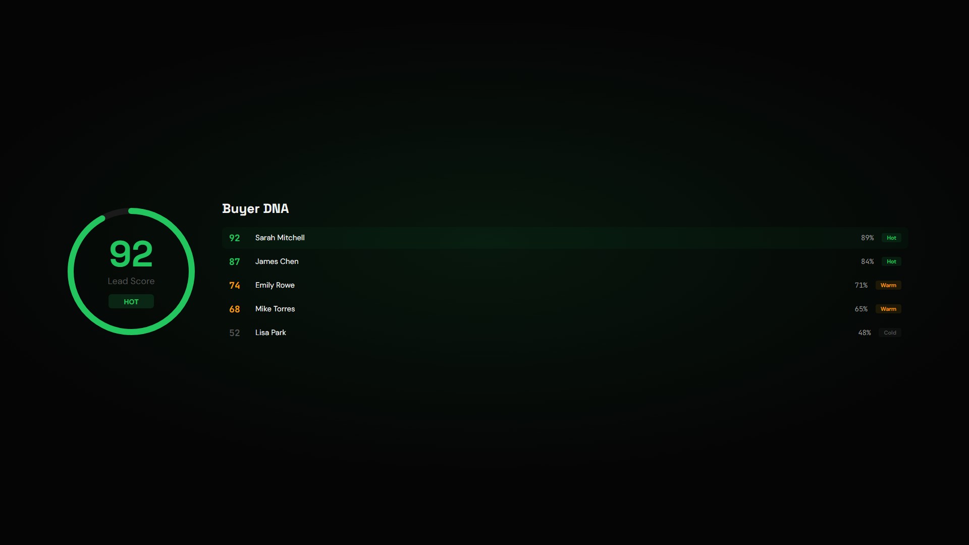 Builds a behavioral fingerprint of your actual converters — then scores every lead 0–100 based on how closely they match. Predictive scoring that gets smarter with every sale. Push hot leads to your CRM before they go cold.