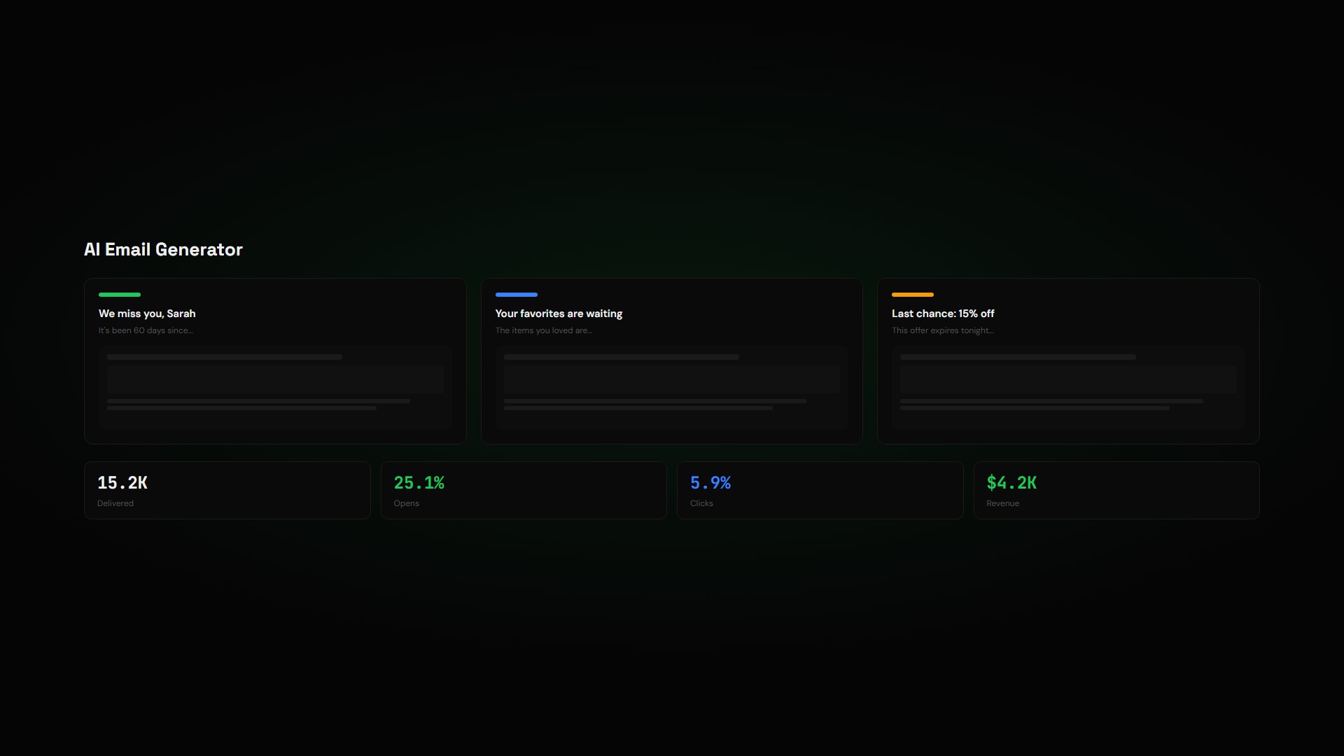 Generates branded email campaigns, triggered flows, landing pages, and A/B tests — all trained on your data, pushed to your CRM and website.