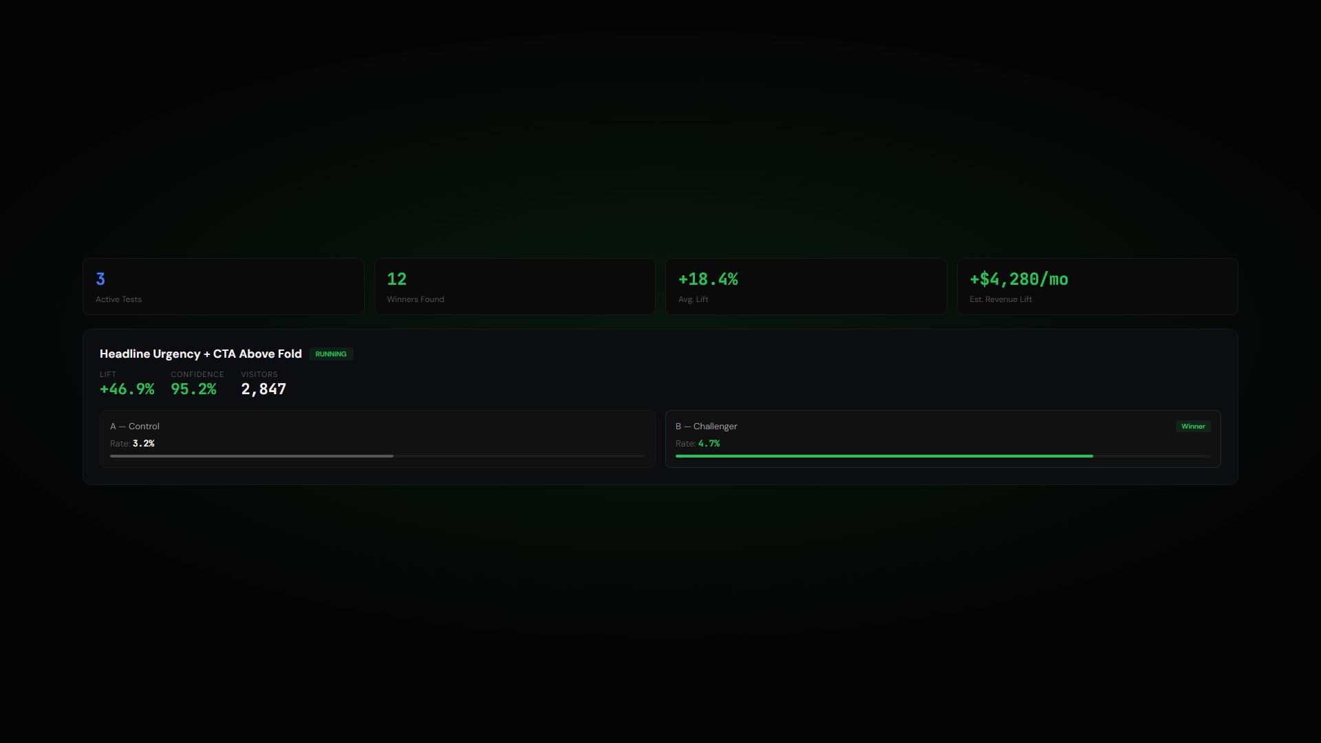Paste any URL. AI scrapes the page, generates a hypothesis, creates a variant, and runs the test through your tracking script. Winners auto-apply at 95% confidence.